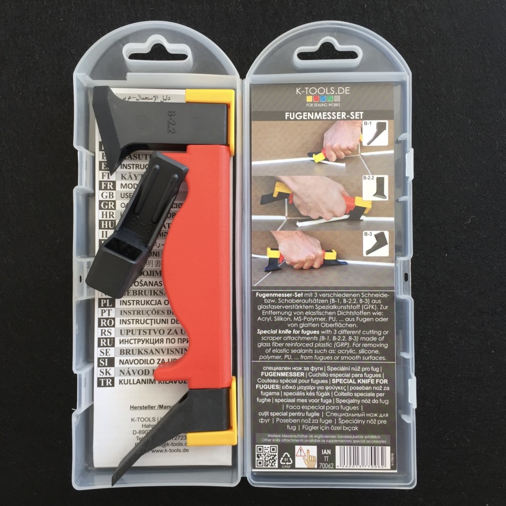 - Mit den Adaptern B-1, B-2.2 und B-3 kann man elastische Dichtstoffe auf Basis von Acryl, MS-Polymer, PU oder Silikon aus alten, defekten oder schimmeligen Fugen oder von glattem Untergrund herausschälen oder behutsam herausschaben.